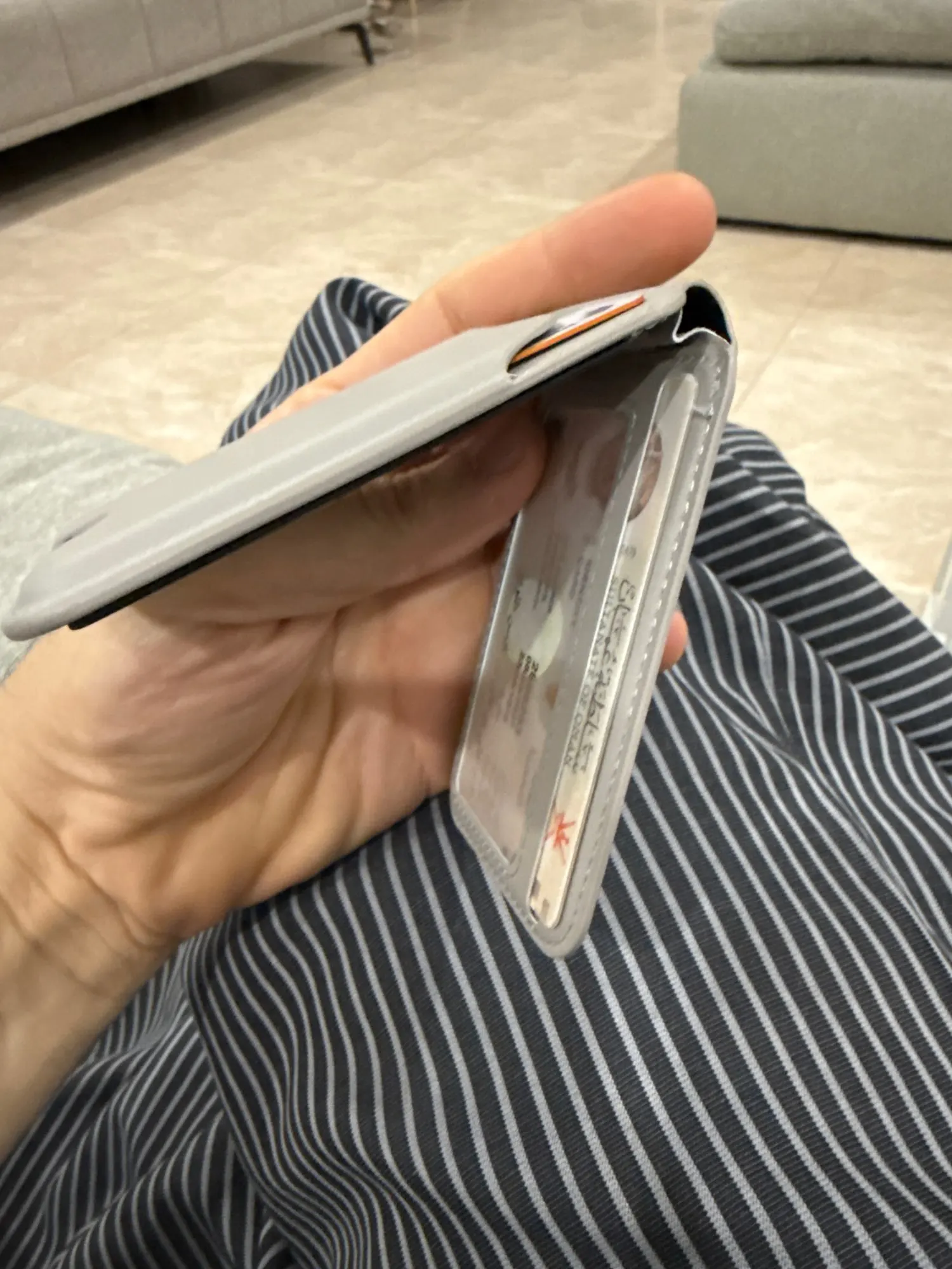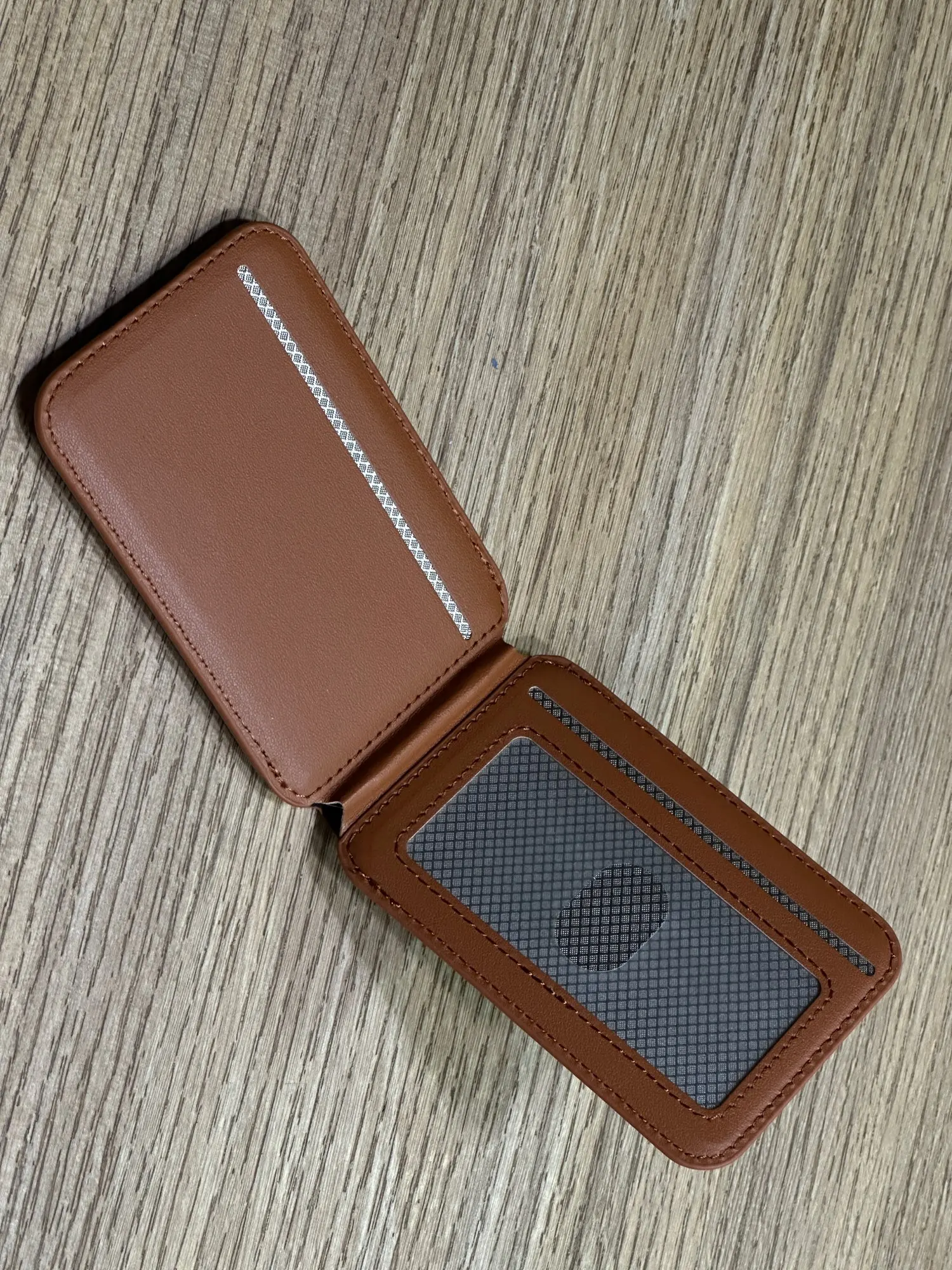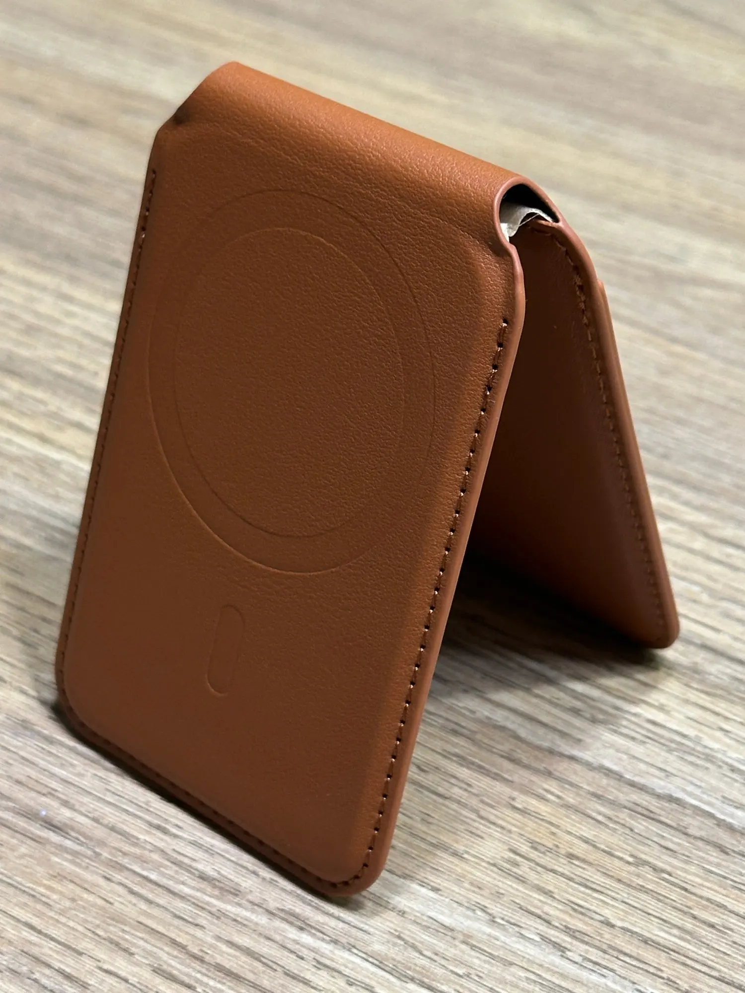 I thought it would be much thicker, but it’s exactly twice as thick as a genuine Daiso or Apple one-slot card wallet. It seems like there’s a spring in the hinge because it makes a clicking sound when opening or closing completely, and it stays firmly in place at the desired angle.