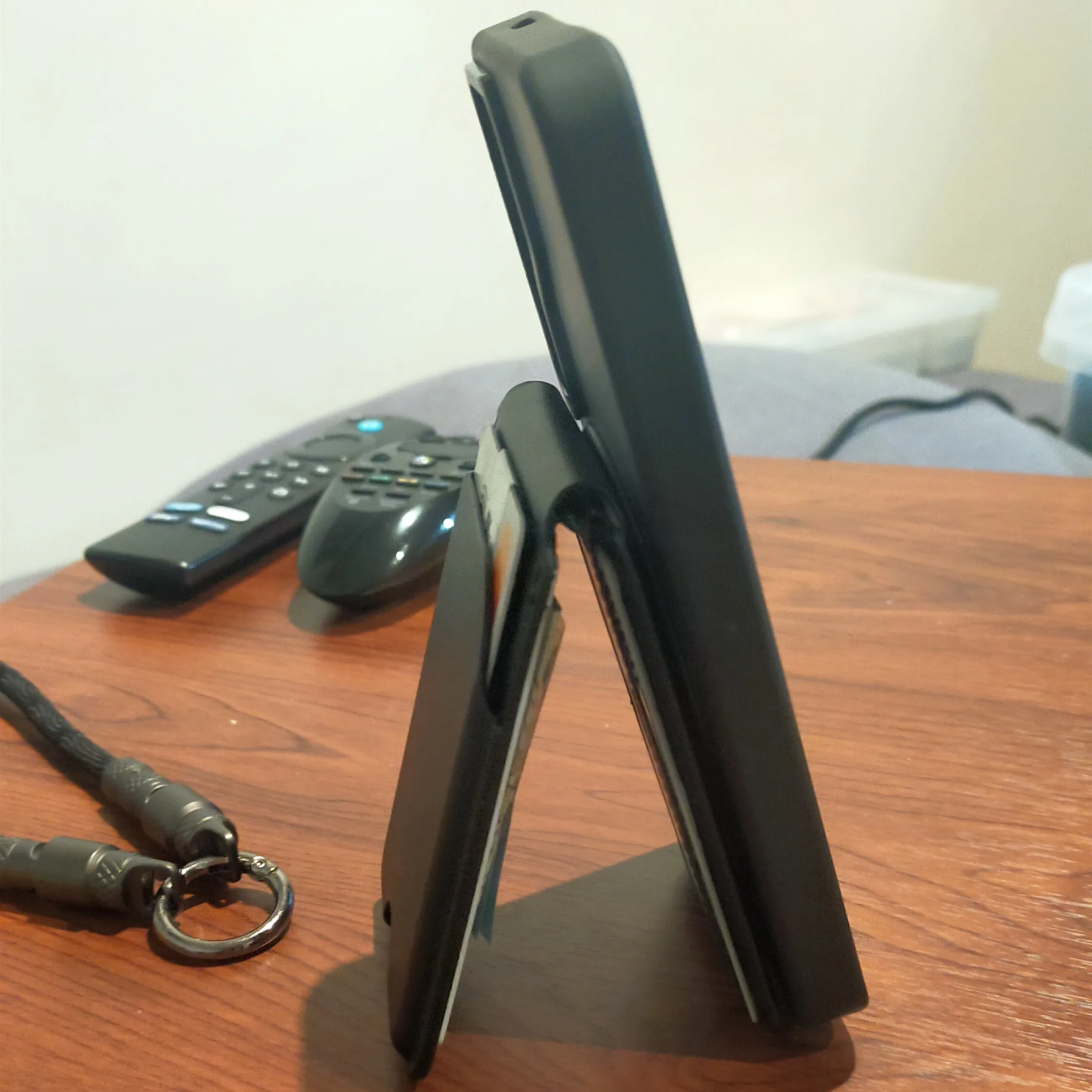 I only carry three cards, and I’m satisfied with it. The hinge is strong enough to hold it horizontally or vertically. When carrying it around, if you close it as much as possible with your fingers, it doesn’t fall out easily.