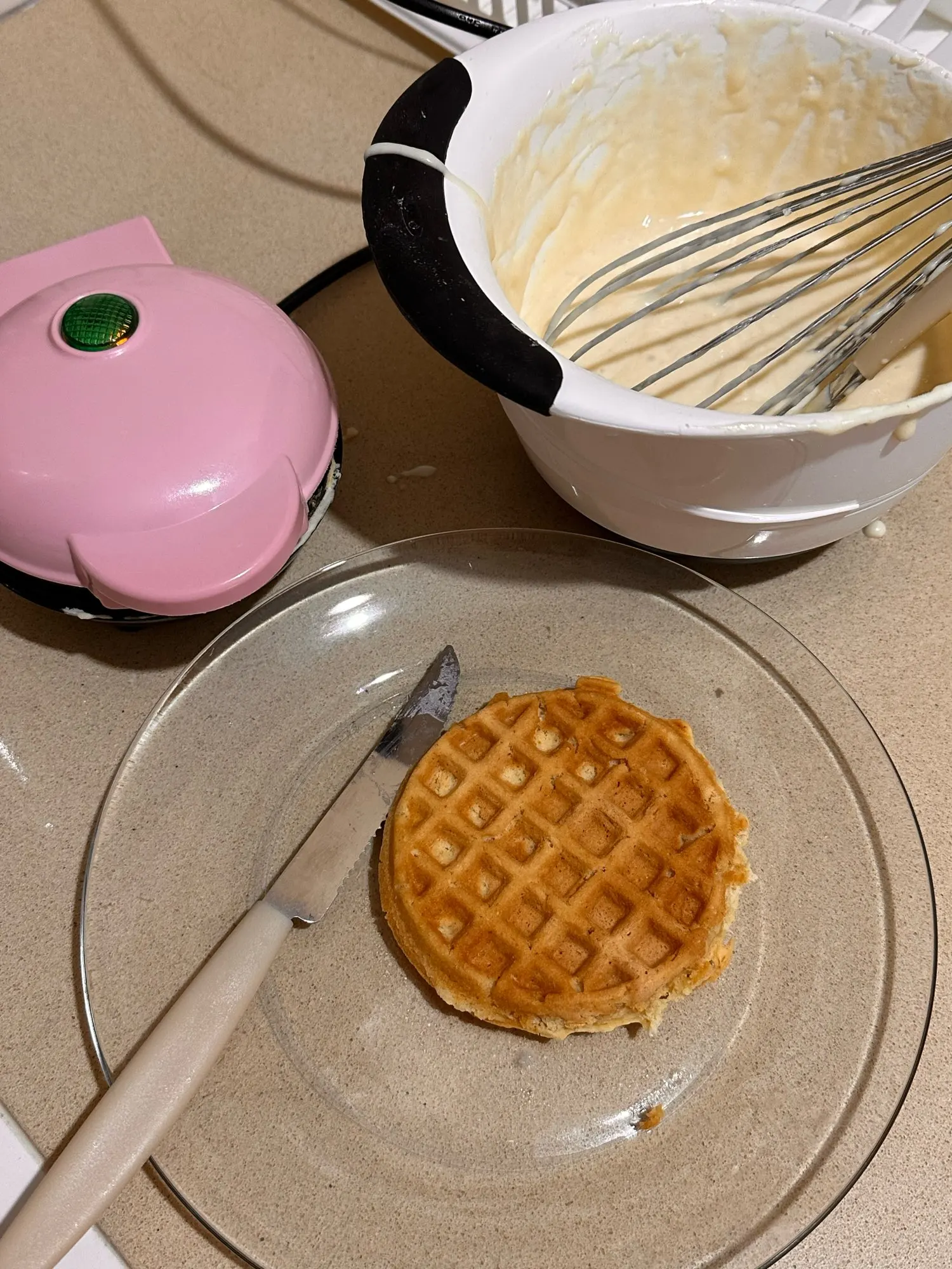 Weiten with the next waffle. Oil -> Dough -> Waffle.